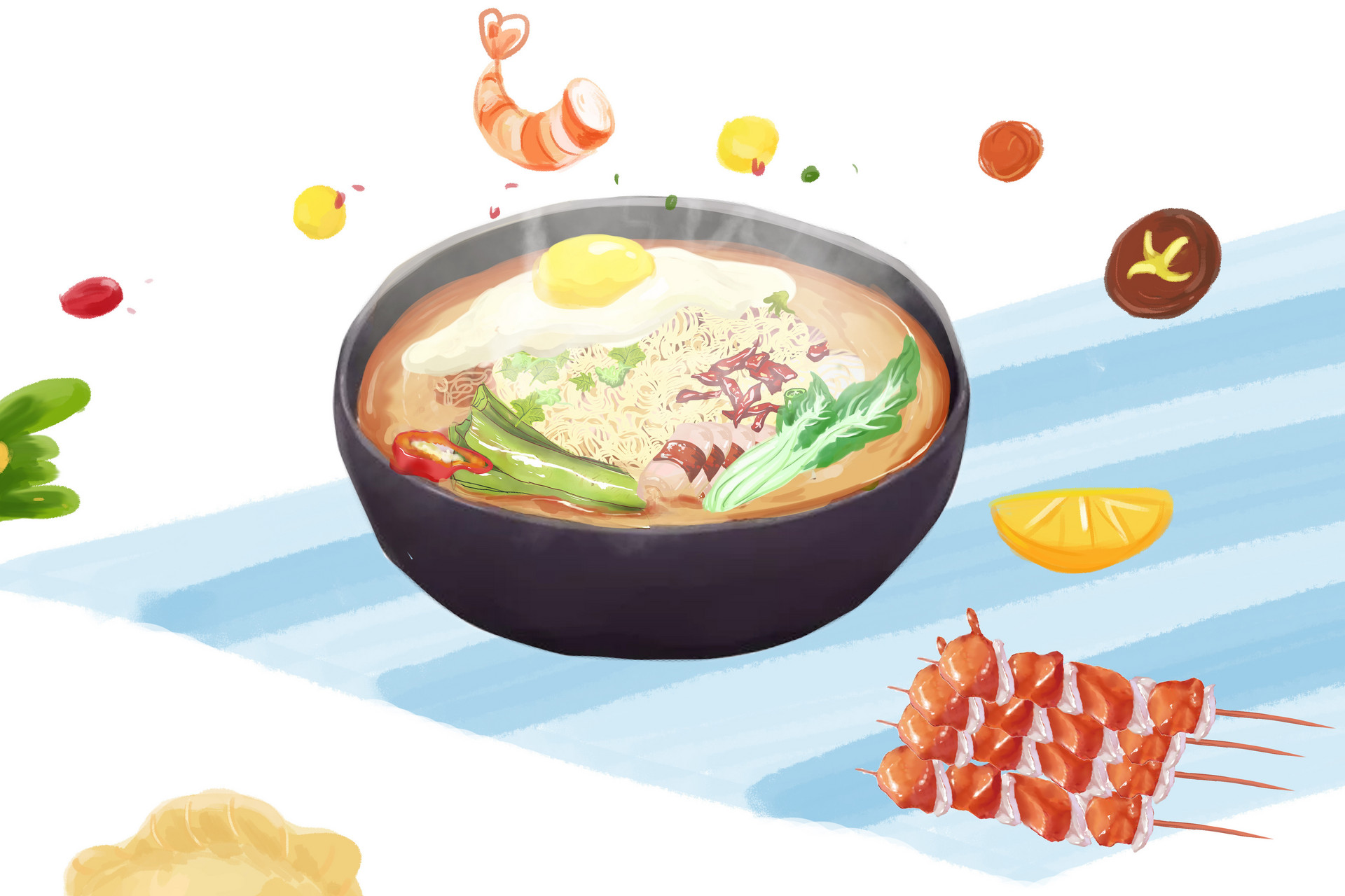 “叮”,闹钟响了!“开动!”我边说边拿起筷子,像龙卷风一样把面全吸了进去。