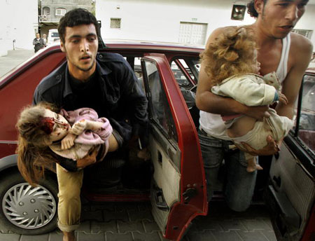 巴勒斯坦人把在冲突中受伤的儿童送往医院。