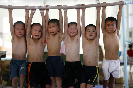 在小学上体育课的中国小学生。