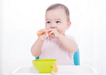 这时候可以让宝宝适当的吃一些蔬菜,蛋黄,馒头,饺子等食物,软硬度和香蕉一样就可以,可以让宝宝每天三次用手抓或者用勺子吃。