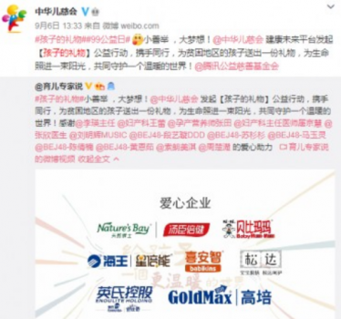 据了解,本次爱心公益活动更有多位明星、母婴专家与KOL以及企业爱心助力,携手同行为贫困地区的孩子们送出一份礼物。孩子的成长不能等,让我们一起为爱加油,给边远乡村的孩子送上一份健康的礼物,给孩子一个更温暖的世界!