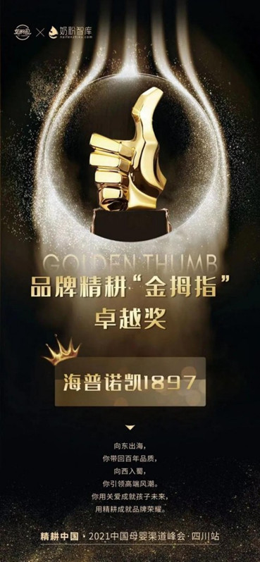 此次为海普诺凯1897颁发的品牌精耕“金拇指”卓越奖,是母婴行业领域最具广泛影响力的行业大奖之一,以其严谨、严肃、严苛的组织及评审原则,受到业界的广泛追捧。其主办方奶粉圈&奶粉智库,更是中国权威的奶粉产业全媒体,历年来一直致力于携手各行业、品牌、渠道大咖聚焦行业热点,深挖母婴痛点,聚力专业精耕,从现象、痛点、观点、案例、趋势,到解决应对之道,力求能最大限度地从更多维度奉献更加专业的实战内容,链接品牌、渠道及消费者,为母婴渠道赋能。