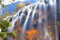 九寨沟五绝之叠瀑一天,九个姑娘趁阿爸不在,变成一群彩蝶飞了出去。时值正午,她们来到十二座大雪峰的上空,发现下面沟谷纵横,霉烟四起,清泉溪河全都变成了污水毒气,庄稼都枯萎了,山林中的鸟兽横七竖八地死在溪水旁,老百姓也都一个个死在道路两旁。九个姑娘立刻变幻成人形,走到一位奄奄一息的老婆婆面前,问她这里发生了什么。老婆婆说:“姑娘,你们快走吧。这里来了个叫蛇魔扎的妖怪,据说,他只要杀死十万条生命,就能天下无敌。他在所有的河里都投放了毒物,把这里变得乌烟瘴气,毒死很多生命啊。”